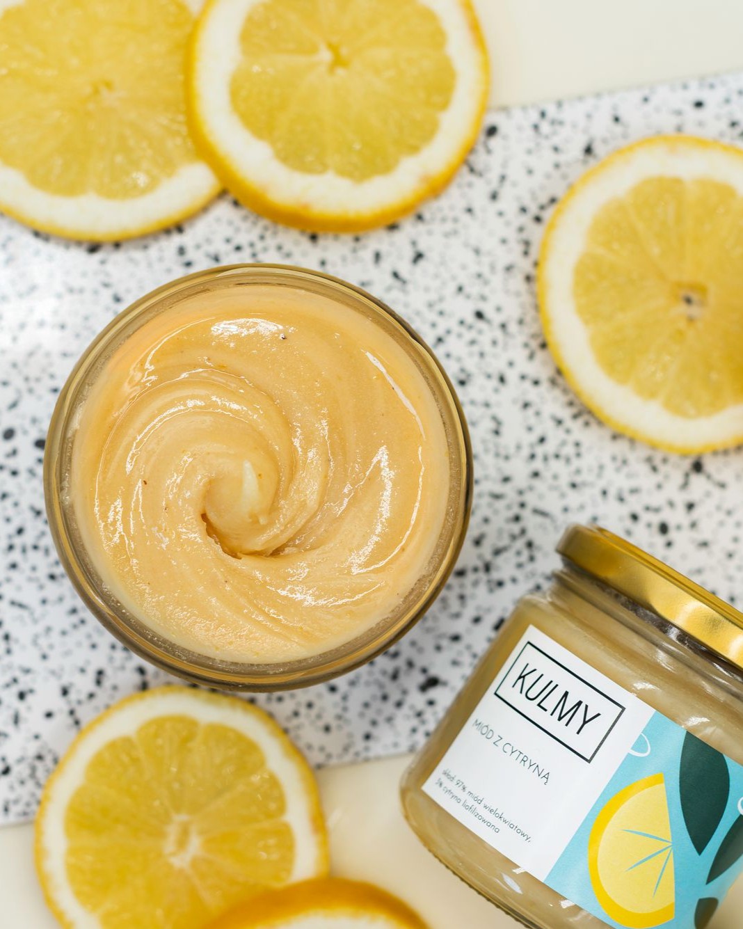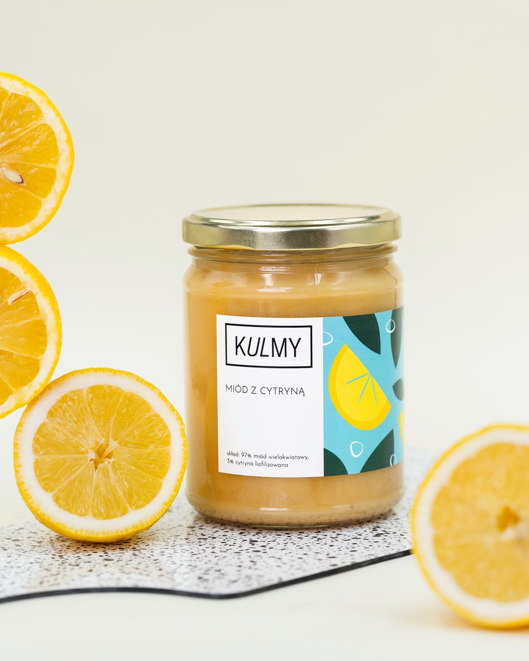 MIÓD Z CYTRYNĄ OD KULMY Nic tak nie dopełnia smaku miodu, jak kwaśny owoc. A najpopularniejszy kwaśny smak daje oczywiście cytryna! Czy w lemoniadzie, czy w herbacie, układ jest ten sam: kwaśny ze słodkim doskonale idą w parze. To znaczy że miód może być orzeźwiający? I to jak! JAK POWSTAJE To proste. Wybieramy nasz najlepszy miód wielokwiatowy, który następnie kremujemy przez kilka dni. Kremowanie miodu polega na intensywnym mieszaniu w kremownicy, tak długo, aż nabierze delikatnej kremowej konsystencji. Następnie dodajemy liofilizowaną cytrynę. Liofilizacja polega na wyciągnięciu wody z zamrożonych owoców. Dzięki temu owoce nie tracą swoich właściwości oraz zachowują pełnię smaku i witamin. Metodę tą pokochali miłośnicy zdrowego żywienia oraz szefowie kuchni.