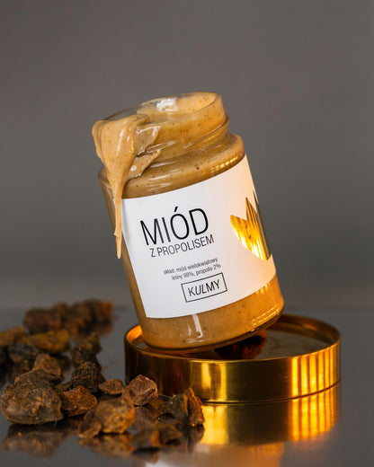 MIÓD Z PROPOLISEM OD KULMY Tegoroczny rozlew miodu z propolisem to zwiększona dawka propolisu, dzięki czemu miód ma jeszcze bardziej żywiczno-orzechowy posmak. Jego kremowa konsystencja, drzewny aromat, to wyróżnik tego miodu. Propolis, który jest zawarty w miodzie, to świetny naturalny stymulator do budowania odporności – pszczoły powlekają nim cały ul w środku, aby chronił je przed zarazkami. Dla ludzi ta substancja również może zdziałać niemało dobrego! Propolis to żywiczna substancja z pąków drzew i krzewów. Pszczoły zbierają go od wiosny do końca jesieni. Pszczela zbieraczka wybiera na to ciepłe dni, aby substancja była jak najbardziej plastyczna. Dodatkowo też pszczoły przeżuwają propolis, aby ułatwić jego transport. Pszczoły powlekają propolisem całe wnętrze ula oraz używają go jako środka dezynfekującego. Dzięki niemu budują system odporności, a wewnątrz ula panują idealne warunki do życia. POŁĄCZENIE MIODU Z TAK CENNYM PROPOLISEM Miód jest naturalnym środowiskiem dla propolisu. Dzięki niemu propolis uwalnia swoje właściwości oraz staje się łatwiej przyswajalny. Smak miodu naturalnie komponuje się z wyrazistym , przyprawowym charakterem propolisu, dzięki czemu mieszankę można jeść prosto ze słoika. JAK SMAKUJE Zdecydowanie ostrzejszy w smaku, pachnący mocno ulem. Ten miód nie tylko lepsze właściwości, ale i głębszy smak. Jeżeli szukasz ciekawych doznań, to miód z propolisem będzie nowym odkryciem.