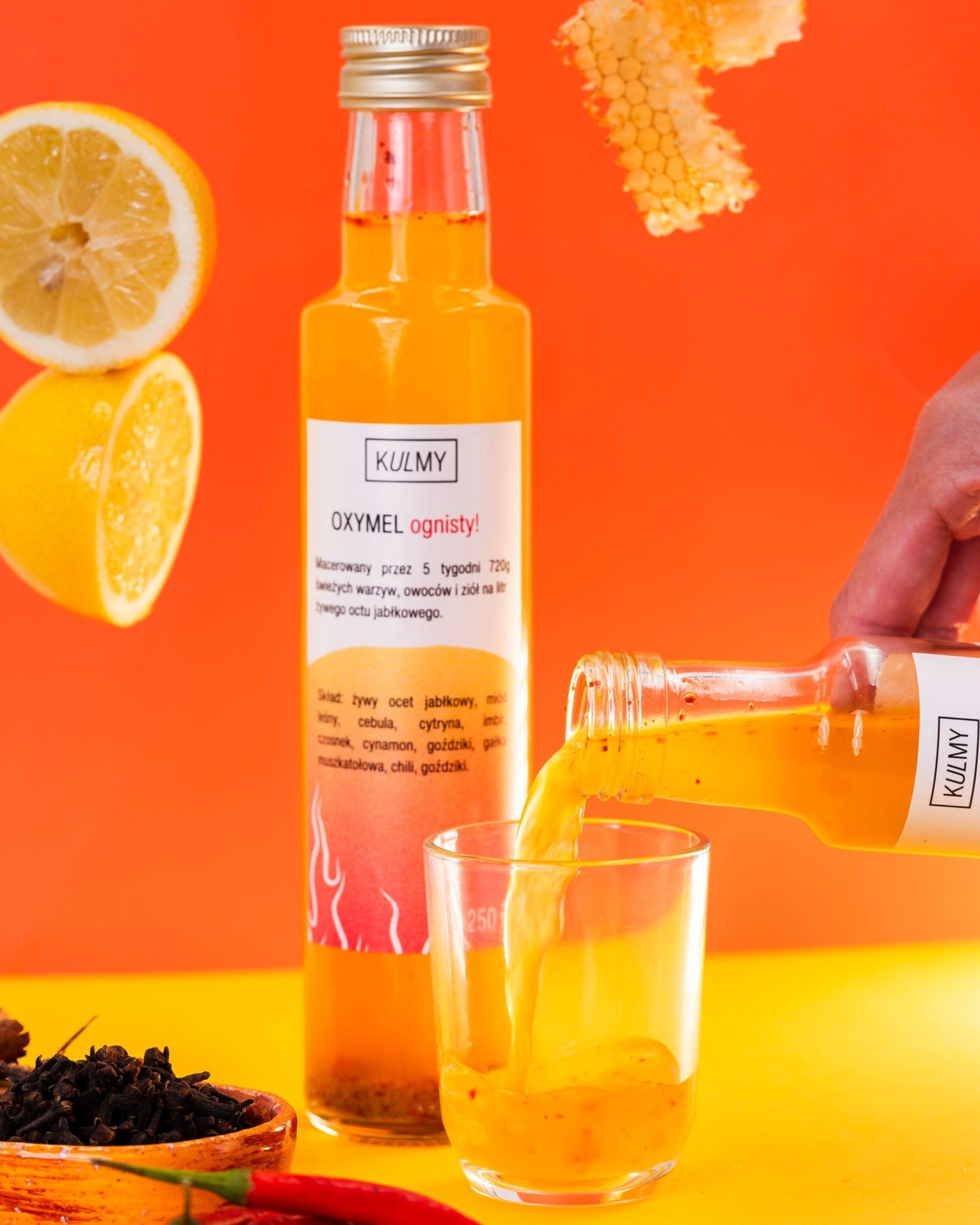 Mocny skok w nowy dzień z najlepszymi produktami od Kulmy. TO oxymel w wersji ognistej zapewnia najmocniejsze doznania. Oxy i mel, czyli ocet i miód, to wyrazista mieszanka mocy stworzona z warzyw, przypraw, octu jabłkowego i miodu. Warzywa tylko świeże i kolorowe. Przyprawy mocne i pachnące. Ocet z najlepszych jabłek, z naszego sadu. I miód – tutaj bez kompromisów. Najlepszy wielokwiatowy miód, nieulepszany, taki jak został stworzony przez pszczoły. Razem daje to mieszankę tak intensywnej dobroci, że dzień staje się od razu lepszy. JAKI SKŁAD To ważne jak został wykonany. Zobaczcie sami jakie to pracochłonne, ale warte każdej kropli. Macerowane przez 5 tygodni 720g świeżych warzyw, owoców i ziół na litr żywego octu jabłkowego. Skład: żywy ocet jabłkowy, miód leśny, cebula, cytryna, imbir, czosnek, cynamon, goździki, gałka muszkatołowa, chili, goździki.