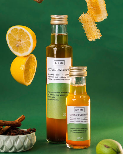 Oxymel to podstawa dobrego dnia. Wybierając ten orzechowy, na start otrzymujemy moc smaku, jakość najlepszych składników i działanie. Dzięki połączeniu z przyprawami oxymel ten może wesprzeć Cię działaniem przeciwwirusowym, przeciwgrzybicznym i przeciwbakteryjnym. Wiele osób chwali go też za jego pozytywny wpływ na florę bakteryjną, a także stosuje go jako pomoc w zwalczaniu infekcji górnych dróg oddechowych i obniżeniu poziomu cholesterolu. To najlepszy kompan na rześkie poranki. Rozrobiony z wodą daje idealnego kopa energii od samego rana, wspierając nasz organizm o i dbając naturalnie o nasze zdrowie. Oxy i mel, czyli ocet i miód, to wyrazista mieszanka mocy stworzona z octu jabłkowego, miodu i kluczowego połączenia z octem z zielonego orzecha włoskiego i mocnymi przyprawami. To dzięki tym składnikom zyskujemy wyjątkowe właściwości! A miód? – tutaj bez kompromisów. Najlepszy gryczany miód, nieulepszany, taki jak został stworzony przez pszczoły. O głębokim smaku, aromacie i bez kwaśnej octowej nuty dzięki użyciu dużej ilości przypraw, długiego naturalnego procesu maceracji – to smakuje! JAKI SKŁAD Proces przygotowania oxymelu jest bardzo ważny. Zobaczcie sami jakie to pracochłonne, ale warte każdej kropli. Macerowany przez 7 tygodni z przyprawami, ocet z zielonego orzecha włoskiego z dodatkiem miodu gryczanego. Skład: ocet z zielonego orzecha włoskiego, ocet jabłkowy, miód gryczany, cynamon, goździki, gałka muszkatołowa, anyż.
